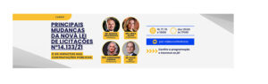 Videoconferência referente as Principais Mudanças da Nova Lei de Licitações nº14.133/21 e os Impactos nas Contratações Públicas. DATA E HORÁRIO DE REALIZAÇÃO: 16,17,18 e 19