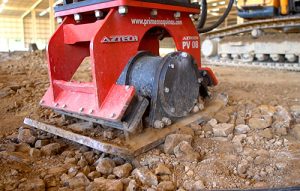 Placa vibratória para compactação aumenta produtividade e segurança nas operações de compactação Implemento hidráulico fornecido pela PRIME Máquinas, marca AZTECH, pode ser acoplado em miniescavadeiras,