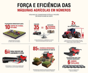 Força e eficiência das máquinas agrícolas transformam produtividade no campo Infográfico destaca como a tecnologia embarcada nas máquinas impulsiona o desempenho no agronegócio A busca