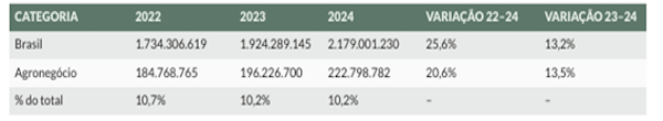 A arrecadação total do governo apresentou crescimento consistente entre 2022 e 2024, passando de R$ 3,34 trilhões para R$ 3,80 trilhões, um avanço acumulado de 13,6%. O agronegócio teve um desempenho ainda mais expressivo, com crescimento de 17,8% no mesmo período, representando cerca de 24,5% da arrecadação nacional em 2024. No mesmo ano, segundo a análise do IBPT, o orçamento total destinado ao Bolsa Família foi de R$ 169,7 bilhões e, portanto, a arrecadação proveniente do agro seria suficiente para custear integralmente o programa.
