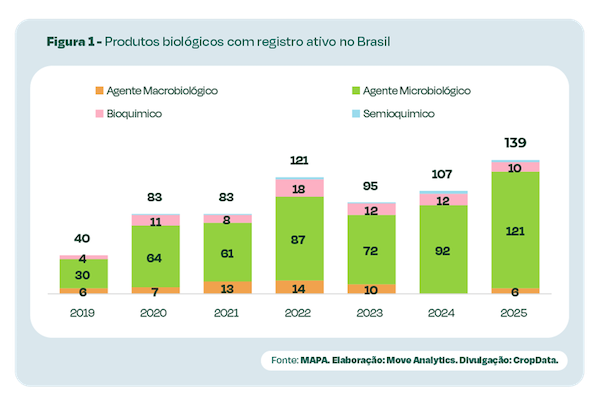 Os agentes microbiológicos contemplam microrganismos como bactérias, fungos e vírus aplicados contra pragas e doenças. Entre os fatores que explicam o aumento de registros de bioinsumos estão a entrada de novas empresas no setor e ampliação da área de biológicos na indústria multinacional.