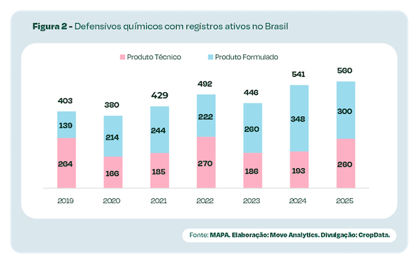 “O recorde de número de registro de produtos para agricultura, considerando químicos e biológicos, é um sinal extremamente positivo de dinamismo regulatório e de ampliação de oferta de produtos do setor de insumos, trazendo em conjunto com esse movimento o fortalecimento da oferta de soluções ao produtor rural e contribuindo para a competitividade do mercado. Ao mesmo tempo, quando a gente olha os dados, a entrada de tecnologias efetivamente inovadoras foi limitada, tanto no segmento químico quanto no de biológicos, que avançaram mais em volume de registros chamados “genéricos” do que a inovação disruptiva”, avaliou o gerente executivo da CropLife Brasil, Renato Gomides, sobre o cenário do ponto de vista da indústria do setor.
