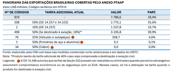 A lista de produtos incluídos no anexo Potential Tariff Adjustments for Aligned Partners (PTAAP), apresentada pela Ordem Executiva nº 14.346, de 05 de setembro, abriria espaço para isenções tarifárias que poderiam alcançar US$ 7,8 bilhões em exportações brasileiras. A ordem executiva define a estrutura para futuros acordos recíprocos e prevê possíveis isenções tarifárias para 1.908 produtos, condicionadas a compromissos em matéria de comércio e segurança. De acordo com a análise da CNI, o anexo abrange 18,4% do que foi exportado pelo Brasil ao mercado norte-americano em 2024. Esse percentual se somaria aos 26,2% já isentos de tarifas adicionais.