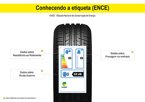 Desde 2012, todos os pneus vendidos no Brasil devem exibir a Etiqueta Nacional de Conservação de Energia (ENCE), conforme regulamentação vigente no país. Ela fornece informações importantes sobre o desempenho do pneu em três categorias: