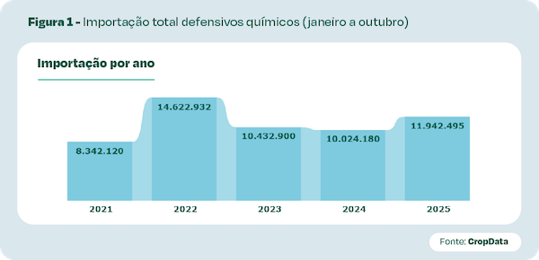 As importações de produtos químicos no acumulado de janeiro a outubro de 2025 tiveram alta de 19% em receita, totalizando US$ 11,9 bilhões de dólares, aumento de US$ 1,9 bilhões em comparação ao mesmo período de 2024. A CropLife Brasil monitora o desembarque de defensivos químicos formulados e, também, em composição técnica e matéria-prima importada, estes dois últimos utilizados pela indústria de defensivos químicos para formulação local.