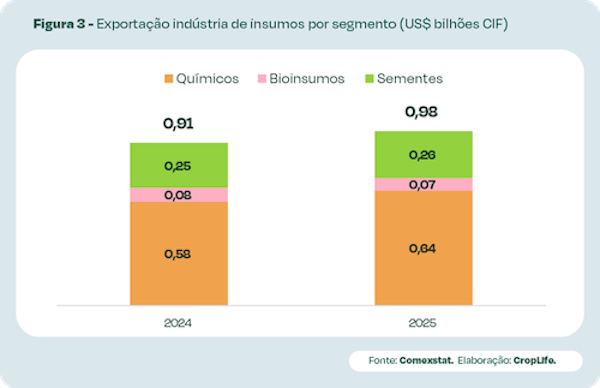 As exportações de soluções agrícolas brasileiras totalizaram US$ 976 milhões em 2025, 7% maior que no ano anterior. O valor fechado é recorde de receita no setor comparado aos últimos 14 anos, puxado principalmente pelas vendas de defensivos químicos (63%) e sementes (27%). Bioinsumos representou 7% do valor total.