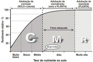 Legenda do gráfico: Gráfico de disponibilidade de nutriente no solo e a estratégia de adubação a ser utilizada. C – adubação de construção, M – adubação de manutenção e R – adubação de reposição. Logo quanto maior os teores dos nutrientes no solo menor o rendimento relativo – ou probabilidade de respostas.