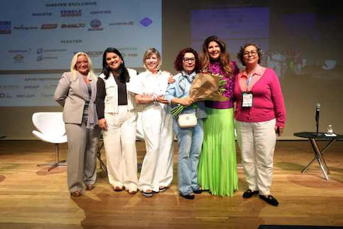 Durante a apresentação, Carla chamou ao palco Marilda Costa Salles Ávila, diretora do Grupo Photon, empresa organizadora do evento e editora da Revista Mercado Automotivo, para receber uma homenagem das participantes do painel.