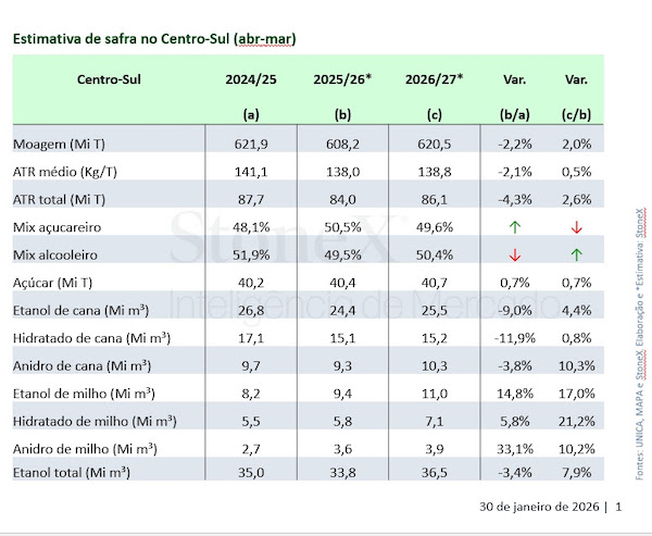 “Ainda que a estimativa seja de que os preços do açúcar devam voltar a remunerar melhor o produtor em SP principalmente a partir de maio/junho de 2026, com a queda dos preços do biocombustível no pico de safra, o contexto atual já deverá ser responsável por uma redução considerável no mix açucareiro”, afirma Borges.