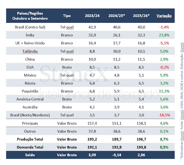 Nova estimativa da StoneX para a safra brasileira de cana-de-açúcar impacta ajustes no balanço mundial, mas mantém oferta confortável e mercado sem pressão por altas