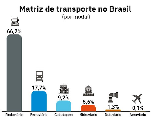 Apesar das vantagens, apenas 9% do transporte de cargas no Brasil é feito via cabotagem. Esse índice está muito abaixo de outras regiões com grandes litorais, como o Japão (44%), a União Europeia (32%) e a China (25%). Dados da matriz de transporte brasileira demonstram essa concentração: o modal rodoviário responde por 66,2% da movimentação de cargas, seguido pelo ferroviário (17,7%), enquanto a cabotagem representa 9,2%.