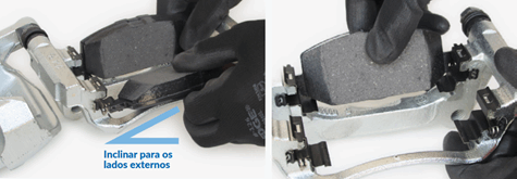 No processo de desmontagem das pastilhas de freio é preciso incliná-las para os lados externos da pinça e puxá-las com habilidade, com o objetivo de encontrar o ângulo correto para retirá-las sem desmontar ou amassar os slippers.