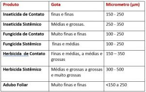 2 – Cada aplicação de agroquímico requer um diâmetro mediano volumétrico (DMV) de gota. “As principais características que influenciam no tamanho de gota estão relacionadas aos atributos físicos da calda, como viscosidade e tensão superficial”, aponta o professor Gandolfo. Veja na tabela.