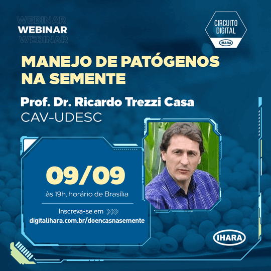 Realizar o controle eficiente no início da cultura de soja é uma das boas práticas agrícolas recomendadas para garantir o máximo desempenho na safra. Pensando nisso, a IHARA, empresa especializada em a IHARA, empresa especializada em pesquisa e desenvolvimento de defensivos para a proteção de cultivos, realiza dentro do Circuito Digital IHARA um webinar sobre o Manejo de Patógenos na semente, no dia 09 de setembro, às 19h.