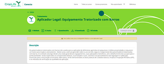 O novo módulo possui 12 videoaulas técnicas e 1 ebook complementar, que totalizam 1 hora e 8 minutos de treinamento, e um questionário de avaliação ao final. O conteúdo abrange visão geral dos equipamentos de aplicação, além do detalhamento de sua operação e particularidades. Entre os assuntos explorados estão os componentes básicos do veículo, suas funções e usos, com foco nos procedimentos de regulagem e calibração essenciais para a otimização e economia. Abordam também cuidados básicos, limpeza e Inspeção Periódica (IPP), e os métodos de verificação da qualidade da aplicação.
