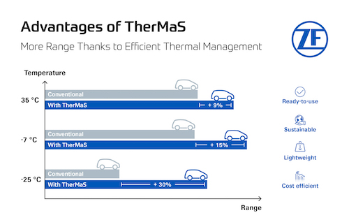 Para melhorar a eficiência dos acionamentos elétricos e, assim, aumentar a aceitação da mobilidade elétrica, a ZF está buscando uma abordagem holística de inovação. Um deles é o TherMaS, um sistema de gerenciamento térmico que a ZF desenvolveu para a maturidade do mercado especificamente para veículos totalmente elétricos. O uso de propano como refrigerante resulta em um desempenho térmico significativamente melhor em altas e baixas temperaturas, bem como em um design de sistema menor e mais leve. Nos testes, o gerenciamento térmico otimizado e o uso mais eficiente do calor residual do trem de força aumentaram a autonomia elétrica em operações exigentes de inverno em até 10% e até 30% em condições extremas.