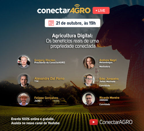 A associação ConectarAGRO irá promover um evento on-line nessa quarta, dia 21 de outubro, às 19h (horário de Brasília), sobre a “Agricultura digital: os benefícios reais de uma propriedade conectada”. A entidade será representada por Gregory Riordan, presidente da associação ConectarAGRO e diretor de tecnologias digitais da CNH Industrial, Alexandre Dal Forno, head de marketing corporativo e IoT da TIM Brasil, e Felippe Gonçalves, gerente de negócios e serviços expandidos da Jacto que discutirão o tema sob mediação da influenciadora digital Aretuza Negri, do canal Ela é do Agro. A live será transmitida por meio do canal no ConectarAGRO no YouTube.