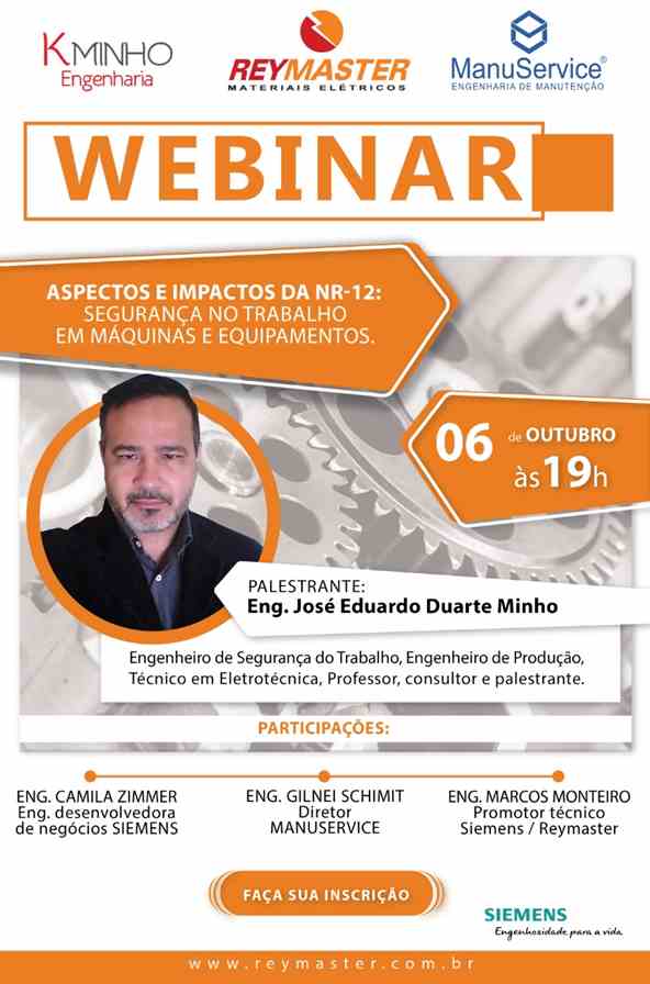 Promovido pela Reymaster Materiais Elétricos, o Webinar do dia 06 de outubro, terá o engenheiro José Eduardo Duarte Minho, da Kminho Engenharia como palestrante e oportunizará uma explanação importante sobre a norma. Ele tem mais de 30 anos de experiência no setor, sendo que 25 deles voltados às áreas de manutenção e segurança do trabalho “A troca de experiências proporcionará aos empresários, fabricantes de máquinas, manutentores, supervisores, engenheiros e demais profissionais o esclarecimento de diversos pontos que podem parecer obscuros e interpretativos da NR12’’, pontua Eduardo Minho.